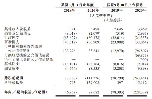 招股书显示,截至2020年9月30日止六个月,公司其他收入及收益为346万元(人民币,下同),同比增长31%;研发开支为3306万元,同比增长38%;期内亏损为2.28亿元,上年同期录得亏损7839万元。