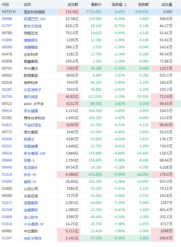 其中,华虹半导体跌超8%,中芯国际、小米集团跌超7%,网易、快手、美团跌超5%,腾讯跌3%。。