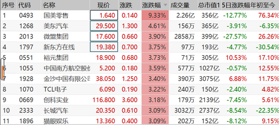 消费股集体拉升,国美零售涨超9%,美东汽车涨超4%,南方航空、金沙中国、长城汽车等涨超3%。