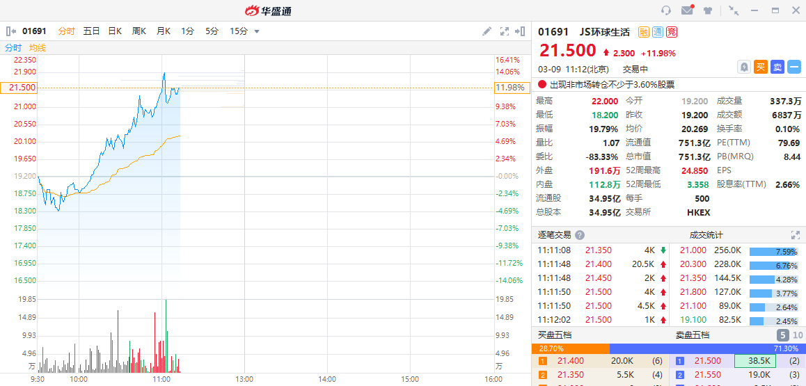华盛资讯3月9日消息,JS环球生活盘中持续大涨,一度涨超13%突破所所有均线。截至发稿,JS环球生活涨11.98%,现报21.5港元每股,暂成交6837万港元,当前总市值为751.3亿。