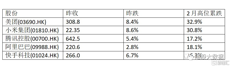 今次跌市由科技股带动,美团(03690.HK)挫8.4%;小米集团(01810.HK)跌8.6%;腾讯控股(00700.HK)跌5.4%;阿里巴巴(09988.HK)跌2.8%,合共拖低恒指415点,已占大市逾7成跌幅。而由下表可见,自2月高位起计,美团、小米及快手科技(01024.HK)都已跌逾三成,调整是否已充足,值得研究一下。
