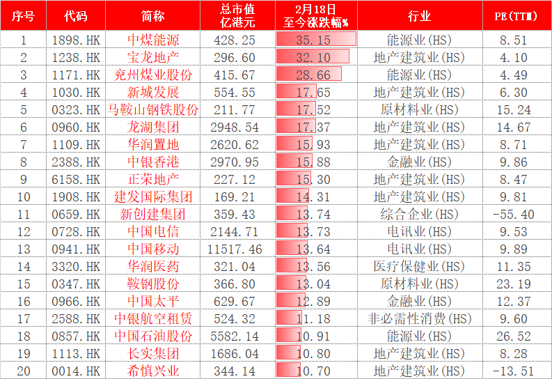 我们通过筛选港股主板在2月18日至今调整过程中,150亿市值以上公司涨幅TOP20可以看到,其中地产业公司有8家,占比最高。