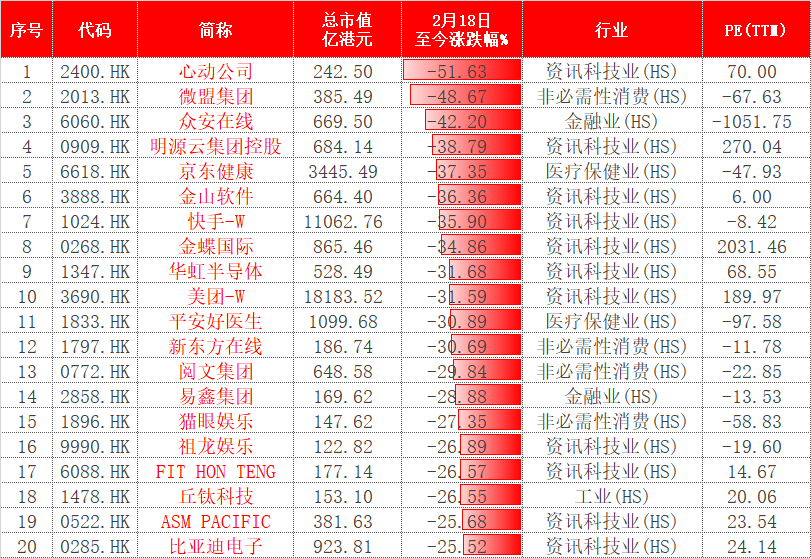 根据筛选,恒生科技指数成分股中,从港股2月18日高点资金累计跌幅排名来看,前20名公司累计跌幅都超过了25%。