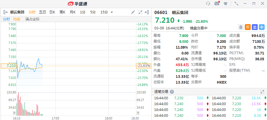 朝云集团(06601)暗盘交易正在进行,该股低开超15.21%,截至16:44报价7.21港元,较发行价9.2港元跌21.63%,每手浮亏995港元,当前成交量994万,成交额7130万港元。该股将于明日(3月9日)正式上市。