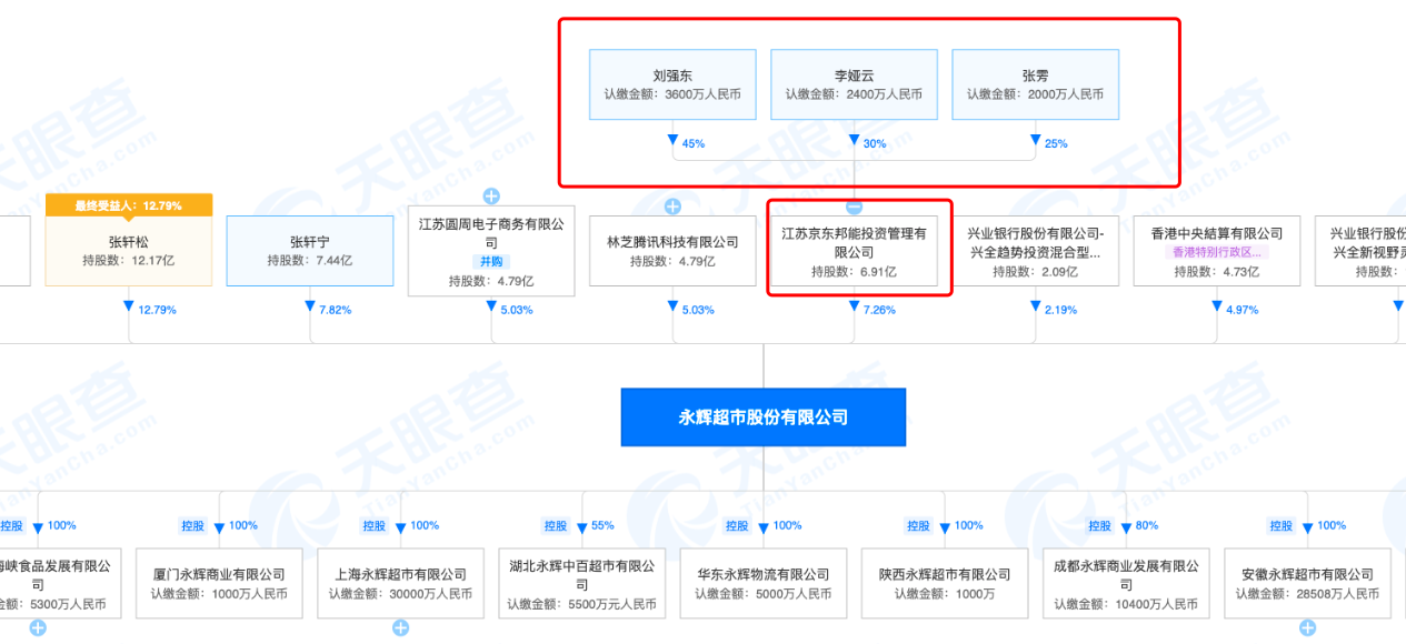 通过股权穿透,中华网酒业发现新增的江苏京东邦能投资管理有限公司为京东关联公司,其实际控制人刘强东,曾于2015年开始增持永辉超市,目前持股比例7.26%跻身永辉超市第四大股东。