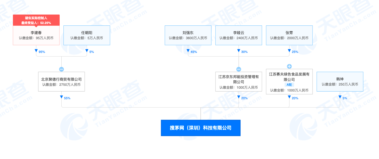 中华网酒业3月9日讯 据天眼查显示,搜茅网(深圳)科技有限公司发生多项工商变更。股东新增江苏京东邦能投资管理有限公司、江苏赛夫绿色食品发展有限公司和韩坤。此外,邢小健退出法定代表人,夏杰接任,其注册资本也从500万人民币增至为5000万人民币,其主要人员也进行了多项变更。