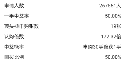 总认购人数267551人,147448人只认购1手(一手党),中签率50%,申请30手稳获1手。