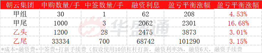 乙头融资打新1200手,按中签28手为例,盈亏平衡点3.01%;