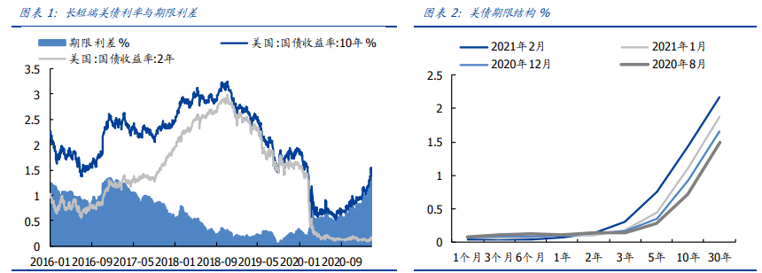 今年 2 月利率出现跳升,由 1.1%最高跃升 43BP 至 1.54%,接近疫情爆发前水平,与此同时,美债短端利率却始终维持在 0.15%左右的低位,期限结构自去年 8 月以来持续呈现“熊陡”状态,期限利差(10 年期美债利率-2 年期美债利率)在长端利率的推动下大幅走阔,最高达 137BP,创 2016 年以来的新高。