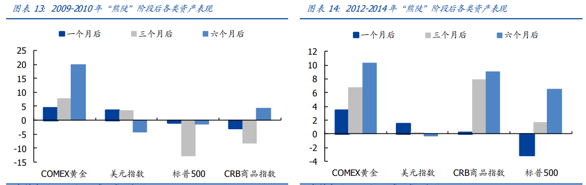 从“熊陡”阶段后的资产表现看,黄金与美元指数短期存在补涨,而从中长期看黄金与大宗商品相对占优。