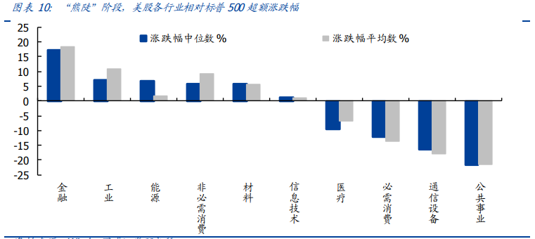 从具体行业看,金融周期类行业在熊陡阶段大幅跑赢。金融、工业、能源等金融周期类行业在“熊陡”阶段往往能够跑赢市场,相对标普 500 的超额涨跌幅中位数分别达17.27%、7.13%和 6.86%,而公共事业、通信设备与必选消费表现相对较弱,超额涨跌幅中位数分别为-21.70%、-16.45%和-12.13%。