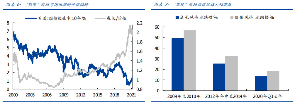 长端利率上行往往隐含着经济复苏,随着经济进一步转好,对价值风格分子端层面的提振更为显著,而小盘股在经济复苏阶段由于更具业绩弹性,得以率先走出危机。在三次“熊陡”阶段,市场风格均明显向价值与小盘偏转,从涨跌幅角度看,价值与小盘也均大幅跑赢成长与大盘。