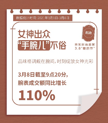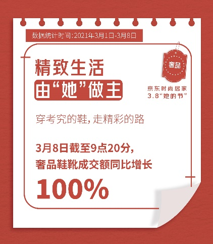 “她的节”是专属女性的狂欢节,作为主角的她们从头到脚展现了自己的时尚与品味。3月8日截至9点20分,京东腕表成交额同比增长110%,用腕间时尚装点女神气质;奢品服饰成交额同比增长170%,奢品鞋靴成交额同比增长100%。同时菲拉格慕自营旗舰店店铺成交额同比增长100%,PINKO自营旗舰店店铺成交额同比增长270% 。
