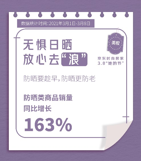 打造精致妆容的同时,赏春、踏青的重中之重,是时刻防备紫外线。“防晒才防老”的忠告响彻耳边,不仅让女性提升了防范意识,更让男性也不敢掉以轻心。3.8“她的节”期间,京东防晒类商品销量同比增长163%,男士对于防晒的重视,不亚于女性,销量同比增长近130%。安热沙小金瓶防晒乳、兰蔻小白管防晒霜、欧莱雅多重防护隔离露成为消费者最喜爱的防晒单品。
