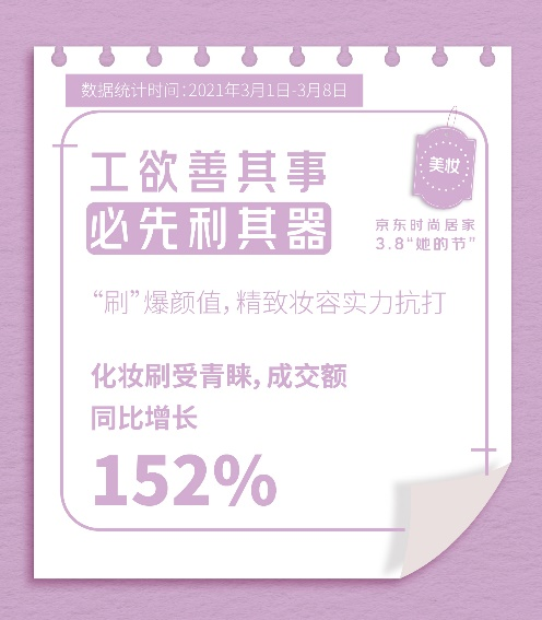 冬去春来,从“猫冬”到“赏春”,女性对于精致妆容的要求日渐提升,“全套搞定美颜”成一大趋势。本次3.8“她的节”,京东彩妆套装成为大热趋势,销量同比去年增长13倍,“中国风”走俏,完美日记小细跟口红细管口红礼盒、花西子x杜鹃定制东方佳人妆奁彩妆套装成消费者最爱国风彩妆礼盒。另外,化妆刷备受青睐,销量同比增长152%,可谓工欲善其事必先利其器,一套顺手好刷,助力女性随时“刷”出精致妆容。