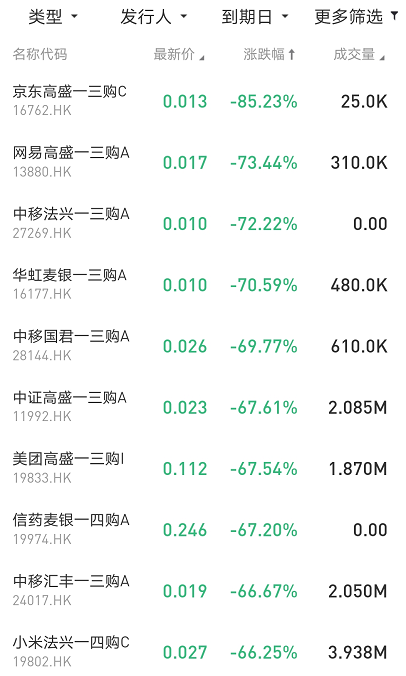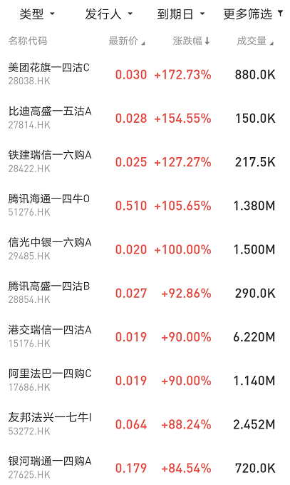 美团花旗一四沽C(28038)涨172.73%占据涨幅榜第一。其次是比迪高盛一五沽A(27814)涨154.55%、铁建瑞信一六购A(28422)涨127.27%。