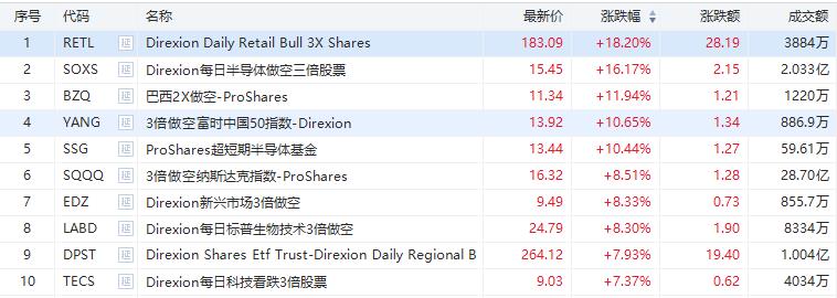 昨日美股涨跌不一,道指涨逾300点并创盘中新高,科技股下跌拖累纳指下挫2.4%。从ETF涨幅榜来看,涨幅居前主要的主要有,每日半导体做空三倍股票的ETF涨16.17%,成交额2.03亿美元;每日科技看跌3倍股票涨7.37%,成交额4034万美元。