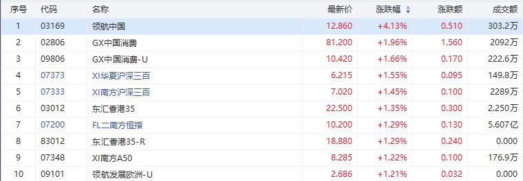 今日港股涨幅居前的ETF主要有GX中国消费的ETF涨1.96%,成交额2092万港元;GX中国消费-U涨1.66%。