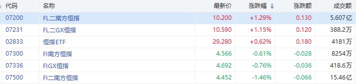 看多恒指相关ETF走强,南方两倍看多恒指(07200.HK)涨1.29%,成交额5.61亿港元。