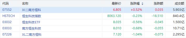 今日恒生科技指数跌0.23%。其中,南方两倍做多恒科(07226.HK)跌1.04%,成交额2.30亿港元;南方两倍做空恒科涨0.52%,成交额5.90亿港元。