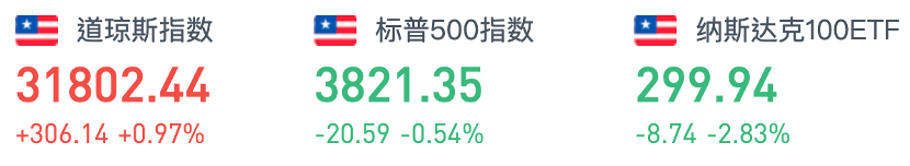 美股周一收盘涨跌不一,道指涨逾300点并创盘中新高,科技股下跌拖累纳指下挫2.4%。周一收盘道指涨306.14点,或0.97%,报31802.44点;纳指跌310.99点,或2.41%,报12609.16点;标普500指数跌20.59点,或0.54%,报3821.35点。