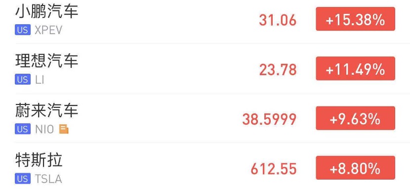 截至发稿,小鹏涨15.38%,理想汽车涨超11%,蔚来汽车涨近10%,特斯拉涨近9%。