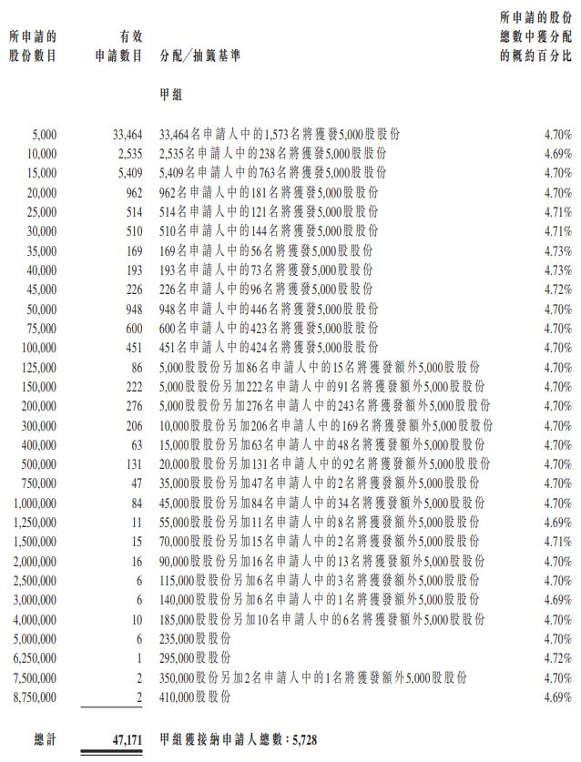 由于公开发售获超额认购超过公开发售项下初步可供认购的公开发售股份数目的50倍但低于100倍,故已应用招股章程所述的重新分配程序,且配售项下初步可供认购的7500万股发售股份已重新分配至公开发售。由于该等重新分配,公开发售项下可供认购的发售股份的最终数目增至1亿股发售股份,相当于股份发售项下初步可供认购的发售股份的40%(于任何超额配股权获行使前),即根据公开发售分配予5756名获接纳申请人。