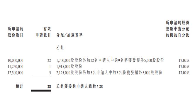 合共147名承配人已获分配发售股份,其中78名已获分配叁手或以下完整买卖单位股份且已合共获分配58万股配售项下初步提呈发售的发售股份(于超额配股权获行使前),占承配人总人数的约53.1%及发售股份总数的约0.2%。