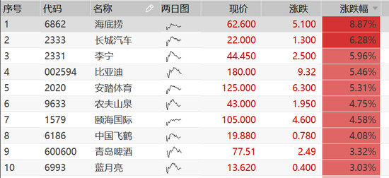 美债收益率周内首次回调,消费龙头集体爆发,其中,海底捞涨近9%,长城汽车涨超6%,李宁涨6%,比亚迪、安踏涨超5%,农夫山泉、颐海国际、中国飞鹤等涨超4%。