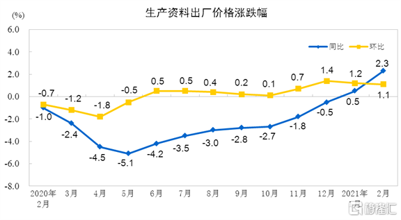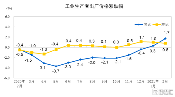 2021年2月份工业生产者出厂价格同比上涨1.7% 环比上涨0.8%