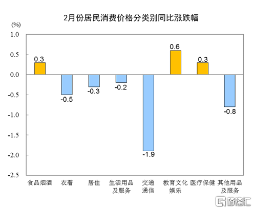 据测算,在2月份0.2%的同比降幅中,去年价格变动的翘尾影响约为-1.8个百分点,新涨价影响约为1.6个百分点。扣除食品和能源价格的核心CPI同比由上月下降0.3%转为持平。