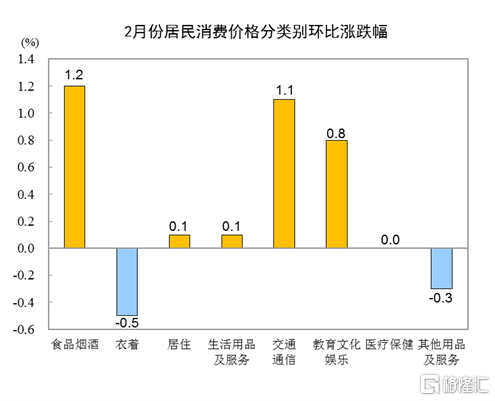2月份,食品烟酒类价格环比上涨1.2%,影响CPI上涨约0.36个百分点。食品中,水产品价格上涨8.7%,影响CPI上涨约0.16个百分点;鲜果价格上涨6.1%,影响CPI上涨约0.12个百分点;鲜菜价格上涨1.8%,影响CPI上涨约0.05个百分点;蛋类价格下降3.8%,影响CPI下降约0.02个百分点;畜肉类价格下降1.0%,影响CPI下降约0.04个百分点,其中猪肉价格下降3.1%,影响CPI下降约0.07个百分点。