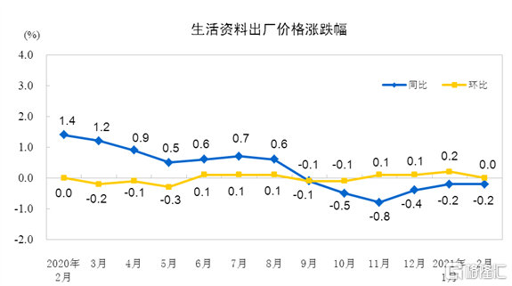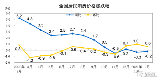 2021年2月份居民消费价格同比下降0.2% 环比上涨0.6%