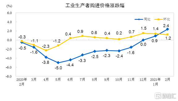 2021年2月份,全国工业生产者出厂价格同比上涨1.7%,环比上涨0.8%;工业生产者购进价格同比上涨2.4%,环比上涨1.2%。1—2月平均,工业生产者出厂价格比去年同期上涨1.0%,工业生产者购进价格上涨1.6%。