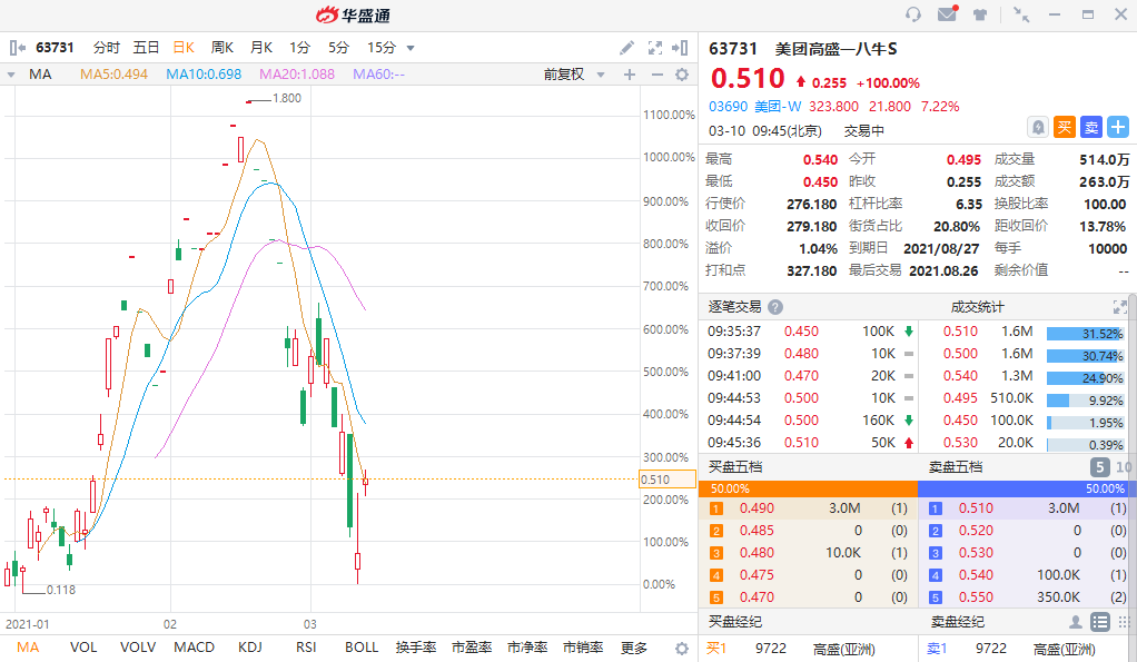 华盛资讯3月10日消息,美团今日强势反弹超7%,现报323.8港元。其衍生品价格狂飙,翻倍上涨。美团高盛—八牛S现涨至100%,行使价为276.18港元,杠杆比率为6.35倍,21年8月27日到期,现距收回价有13.78%的收回距离。