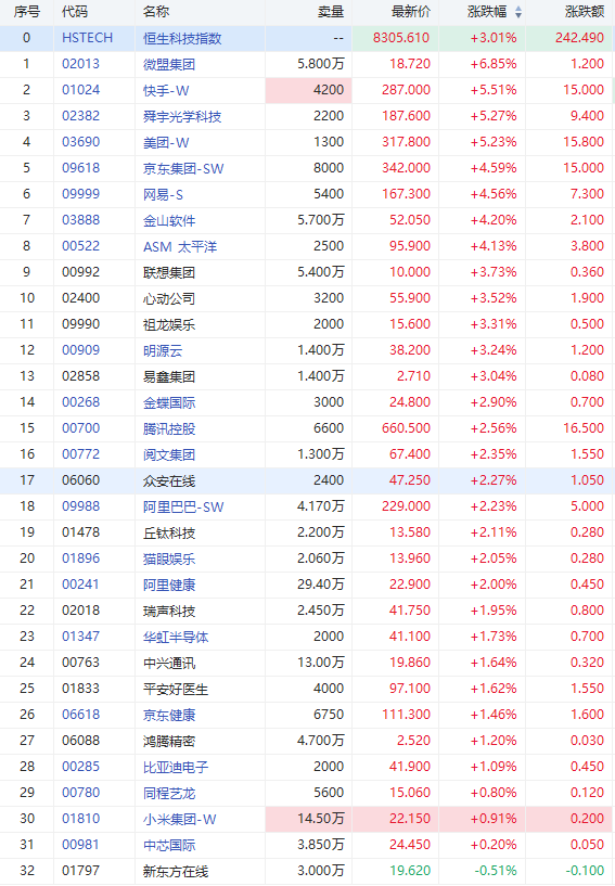 华盛资讯3月10日消息,恒生科指现涨3.01%,报8305.61点。截至发稿,微盟集团大涨超6%,快手、美团涨超5%,京东、网易涨超4%,腾讯、阿里涨超2%。