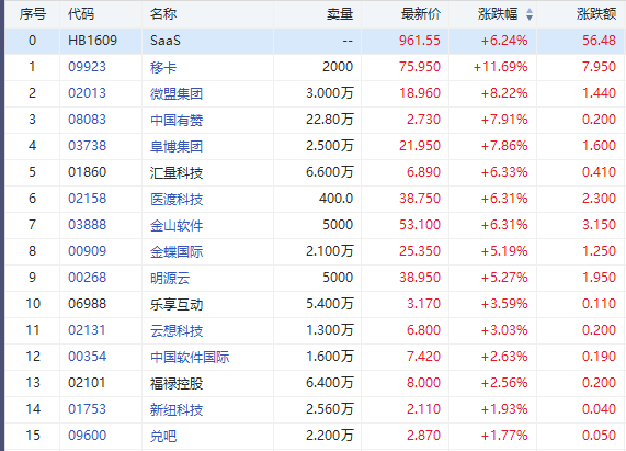 华盛资讯3月10日消息,SaaS概念股今日普涨。截至发稿,移卡涨超11%,微盟集团涨超8%,中国有赞涨超7%,金山软件涨超6%,金蝶国际、明源云涨超5%。