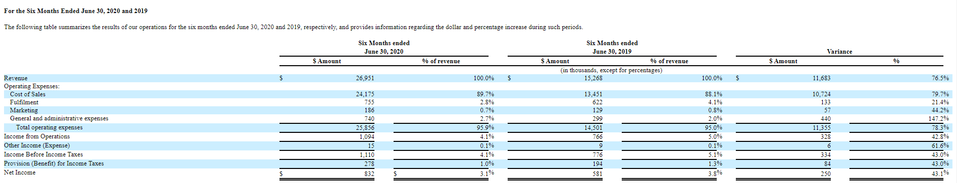聚好商城2020年前6个月收入2695万美元,2019年同期收入1527万美元,同比增长76.5%;2020年前6个月净利润83.2万美元,2019年同期为58.1万美元,同比增长43.1%。