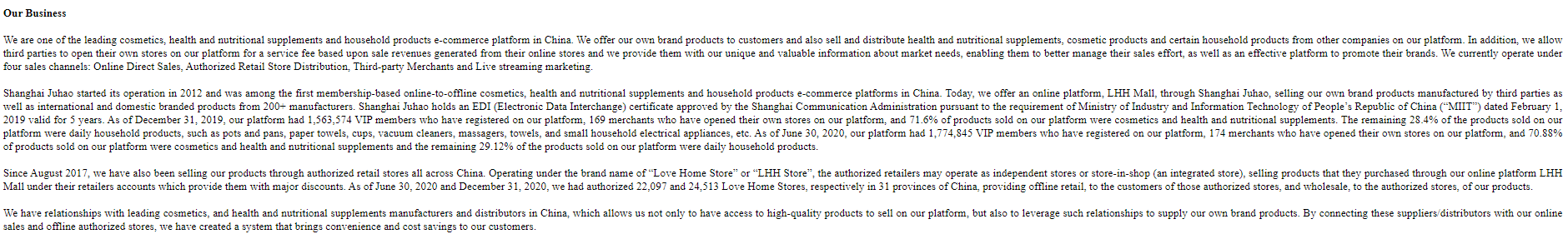 截至2020年6月30日,聚好商城平台共有1,774,845名VIP会员,平台获174家商户入驻。在平台上销售的产品中,70.88%是化妆品和保健品,其余29.12%为日用家居用品。