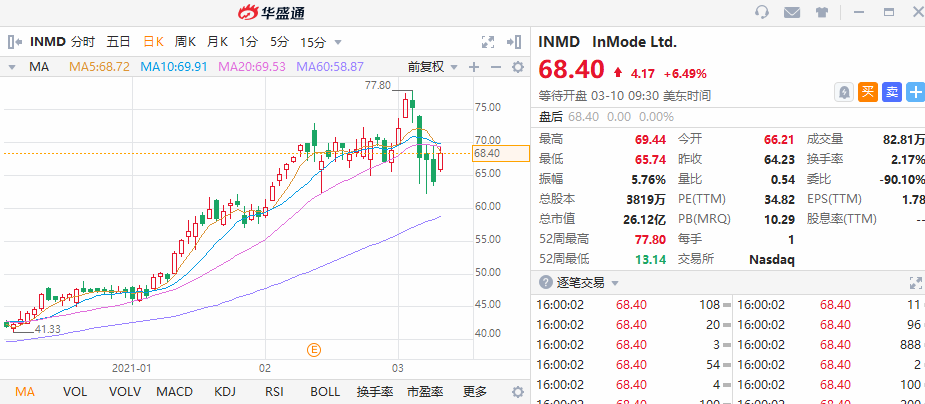 截至隔夜美股收盘,InMode涨6.49%,报68.4美元。自2019年登陆纳斯达克以来,公司股价稳步上涨,由13.5美元涨到最高77.8美元,涨幅将近500%!