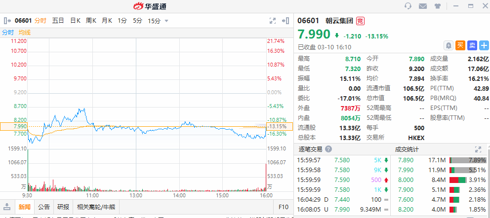 华盛资讯3月10日讯,家居护理生产商朝云集团(06601.HK)首挂收跌13.15%,报价7.990港元,一手账面浮亏605港元。该股最新总市值106.5亿港元,全日最高价8.71港元,最低价7.32港元,成交额17.06亿港元。