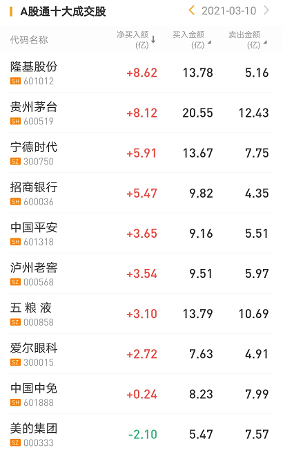 北上资金今日净买入隆基股份8.62亿元,为今日买入之最。此外,北上资金今日净买入贵州茅台8.12亿元。