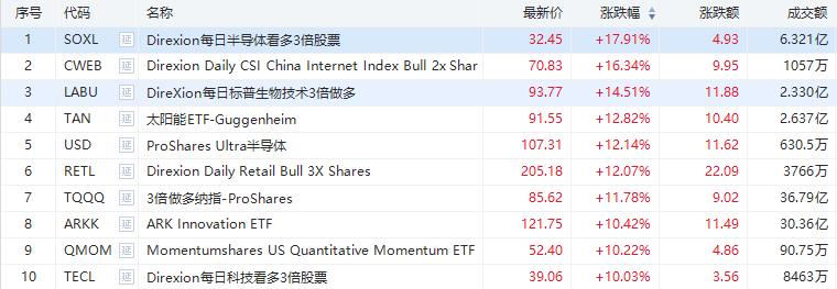 昨日美股收高,纳指创4个月来最大日涨幅。从ETF涨幅榜来看,涨幅居前主要是科技类ETF相关,其中,每日半导体看多3倍股票的ETF大涨17.91%,成交额6.32亿美元;USD的ETF涨12.14%。