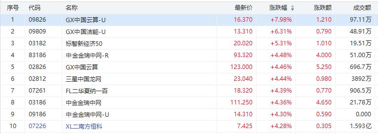 受美股科技股反弹的影响,今日港股涨幅居前的ETF主要有GX中国云算-U涨7.98%;中国节能-U涨6.31%。