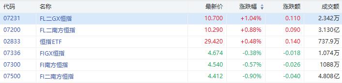 看空恒指相关ETF走弱,其中南方两倍看空恒指(07500.HK)跌0.90%,成交额4.81亿港元;南方一倍看空恒指(07300.HK)跌0.57%,成交额1088万港元。