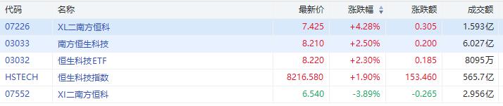 今日恒生科技指数涨2.30%。其中,南方两倍做多恒科(07226.HK)涨4.28%,成交额1.59亿港元;做空两倍南方恒科跌3.89%,成交额2.56亿港元。