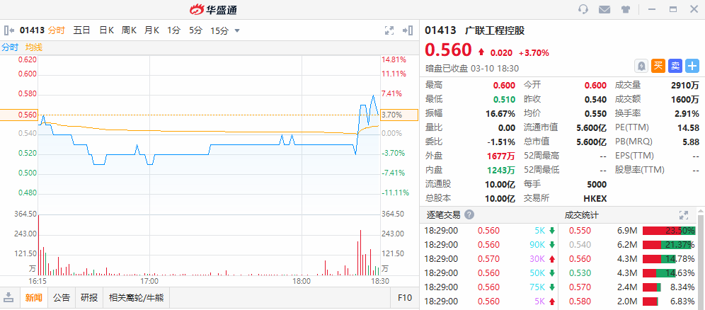 华盛资讯3月10日讯,广联工程控股(01413.HK)暗盘高开超11%,盘中调整后收报0.560港元,较发行价0.540港元涨3.7%,每手账面浮盈100港币。最新总市值为5.60亿港元,成交额1600万港币,该股将于3月11日正式上市。