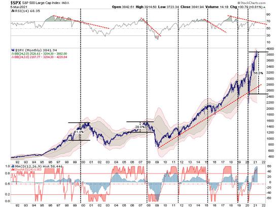 对于那些喜欢类比的人来说,历史上最具可比性的时期是1998-1999年的市场“融涨”。在那期间,市场从支撑位反弹,然后开始了60%的“融涨”,最终在2000年见顶。目前,标普500指数从去年3月份的低点也上涨了近60%。