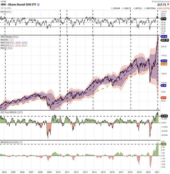 同样的情况也出现在罗素2000指数的周线图上,该指数也增加了中型股敞口。由于这些股票的估值甚至远高于最乐观的经济前景,因此出现下跌的风险很高。