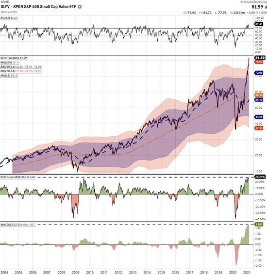 经济重新开放和板块轮换的典型代表是能源股。就像小盘价值和罗素2000指数一样,能源股也极度超买,并偏离了长期均值。
